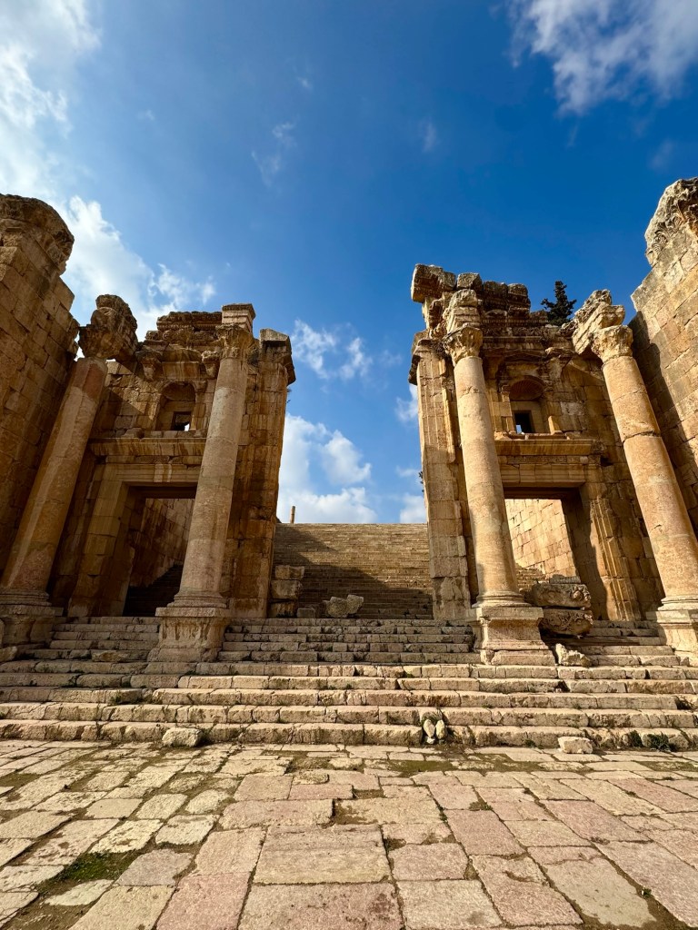My fantastic guide, Anas—and you know he’s amazing if I remembered his name (I am notoriously bad at remembering names)—began the tour through the South Gate, the grand entrance to this remarkably preserved city. From there, we walked into the Oval Plaza, a vast, colonnaded open space that felt like the heart of ancient Jerash. The wide, stone-paved Cardo Maximus stretched ahead, its surface still bearing the grooves left by Roman chariots. We passed the Macellum, once a bustling marketplace, before arriving at the Nymphaeum—a beautifully adorned public fountain and my personal favorite site in Jerash.
