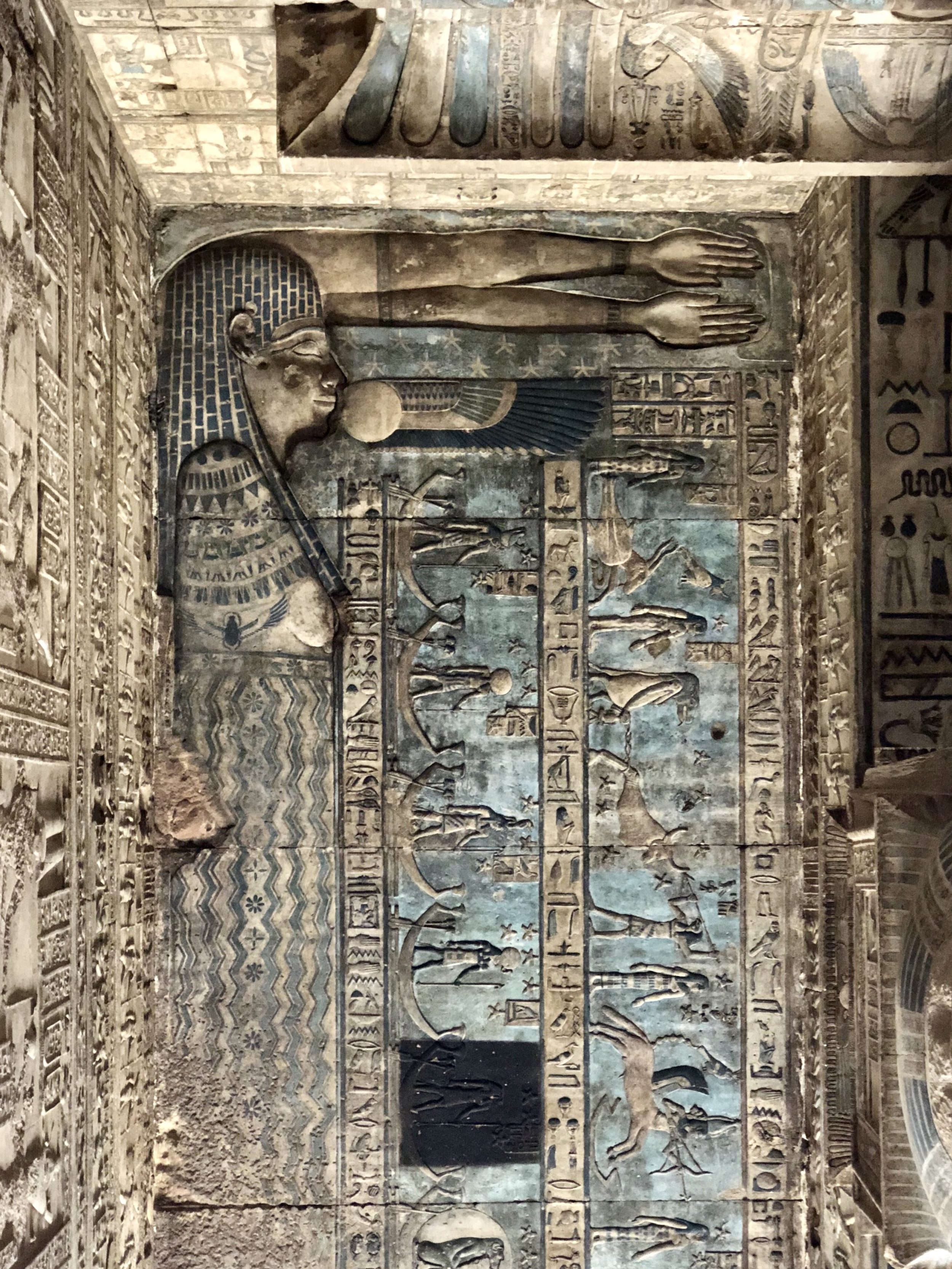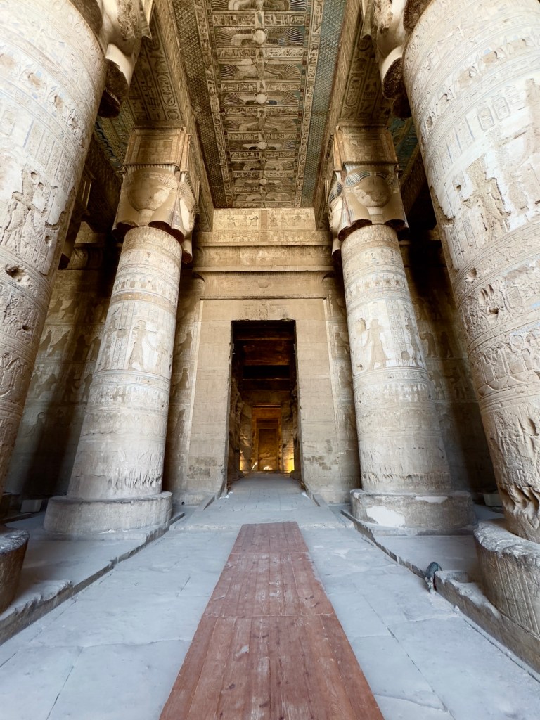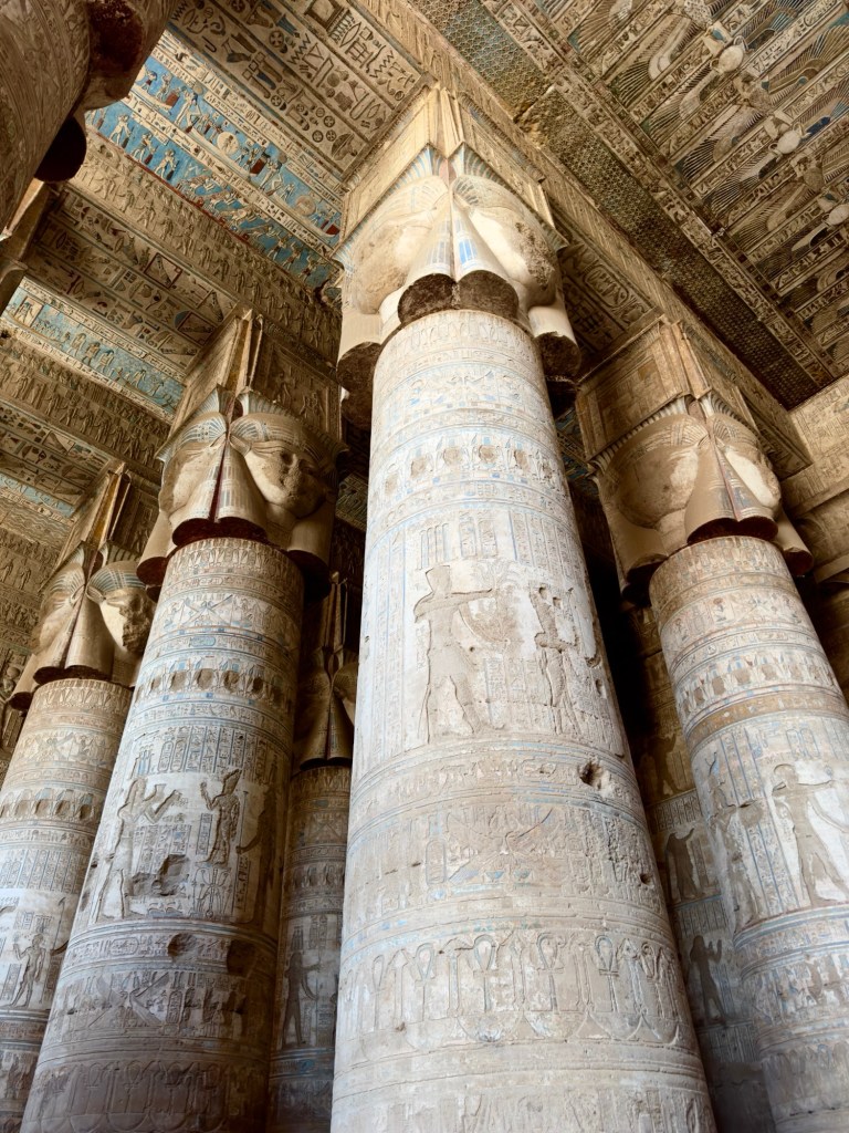 As you enter the massive hypostyle hall, each 24 ornate columns is topped with a capital featuring the face of Hathor, you’d naturally look up onto the famous decorated ceiling with the astronomical scenes carved upon its surfaces, including a zodiac—a rare example of Greco-Roman and Egyptian fusion in art and cosmology.