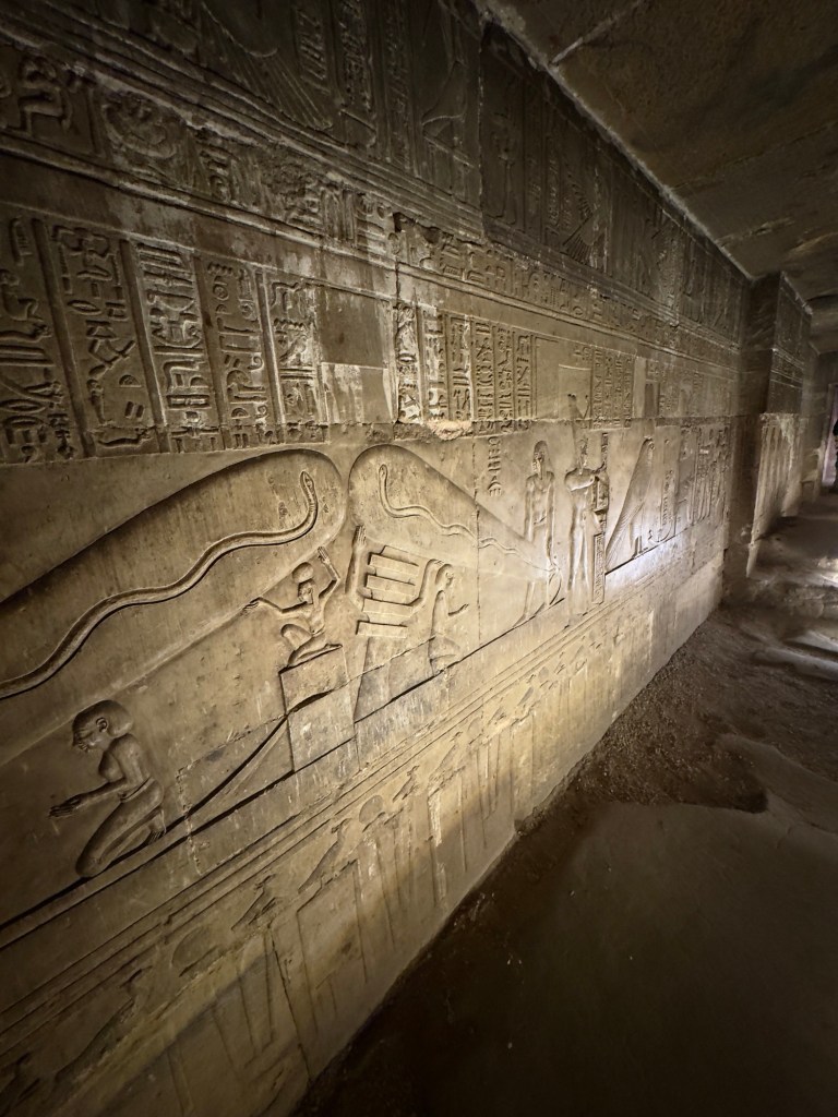 There are around 12 known crypts or treasure caches at Dendera, though only two or three are open to the public. These tight, narrow chambers were originally accessible only to priests, designed to store sacred items like ritual instruments, cult statues, precious metals, and astrological devices — none of which survive today. My guide suggests they were likely “legally looted” and repurposed for ritual use elsewhere.
