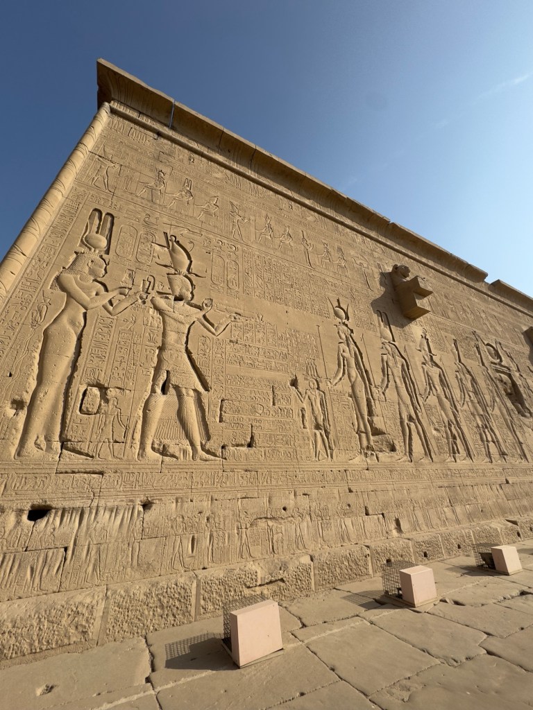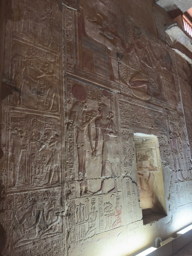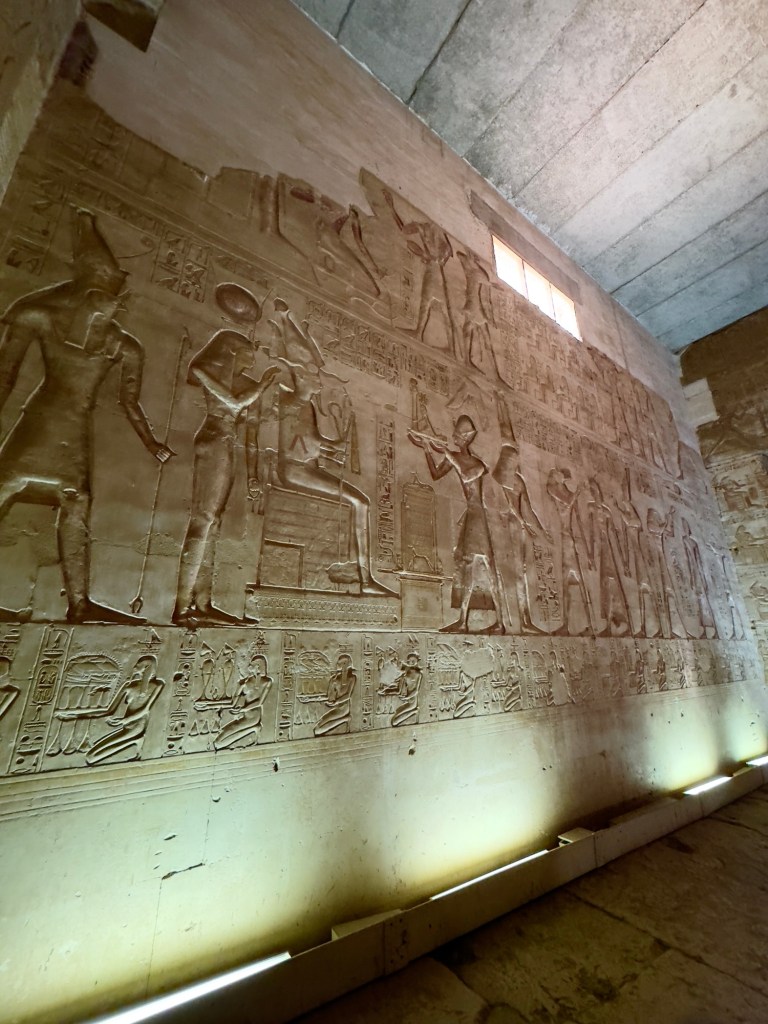The reliefs inside are some of the most exquisite in all of Egypt, deeply carved and finely detailed, showcasing the peak of New Kingdom craftsmanship. The dimensionality is astonishing: individual plaits in garments, the translucent quality of fabric, and the almost 3D placement of ceremonial implements are unlike anything I’ve seen in other temples.