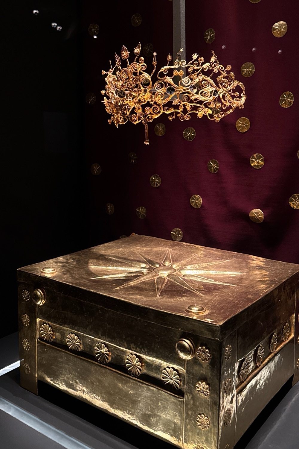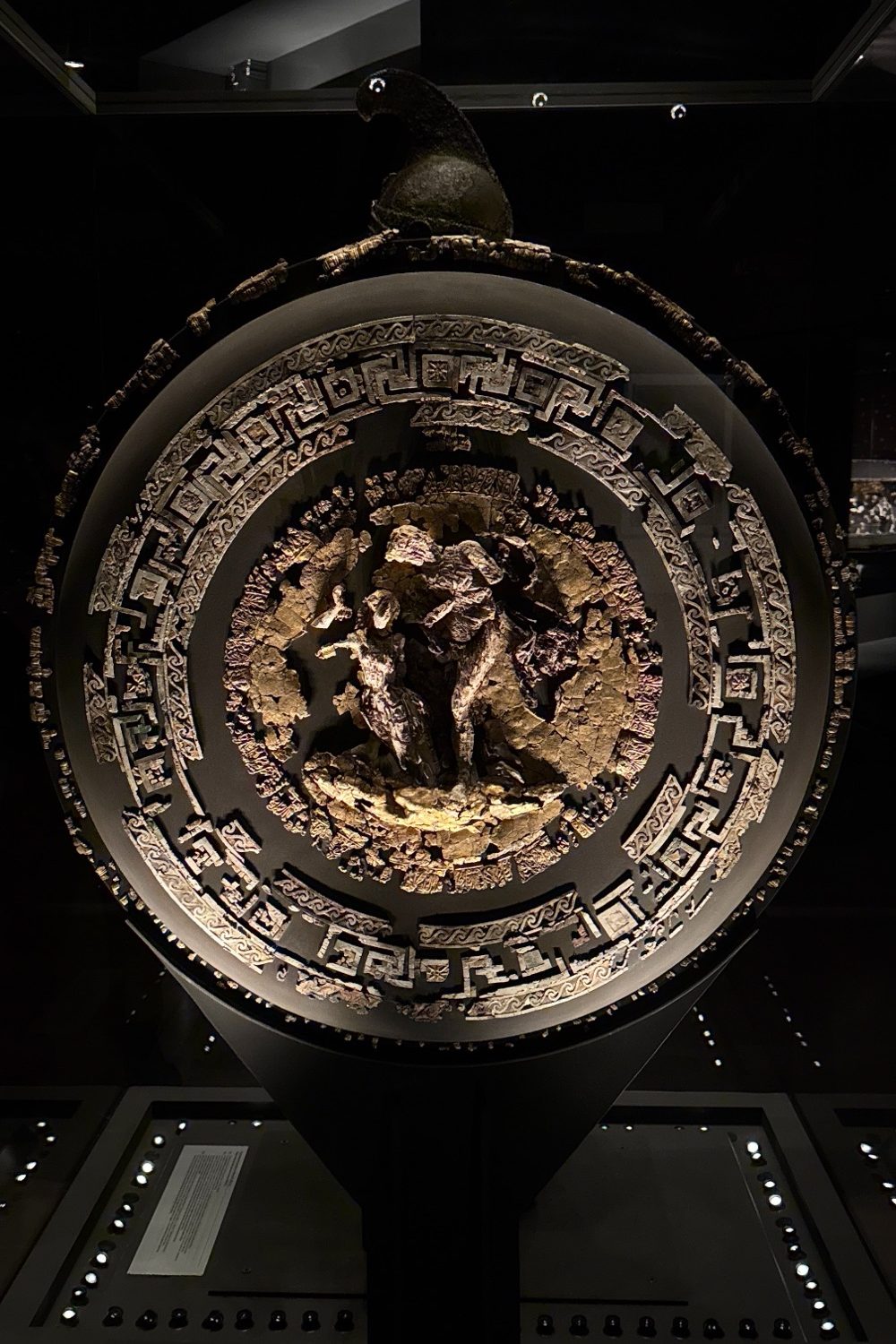The museum itself houses over 500 objects, arranged thematically: Royal Authority, Public & Political Life, Religion & Rituals, Daily Court Life, and Death & Memory. Here you’ll find diadems, armor, ceremonial weapons, inscriptions, decrees, offerings, statues, pottery, funerary steles, and more, arranged being glass cases that make me wonder if the curators has OCD or simply has good aesthetic sense as they were just *chef’s kiss*.