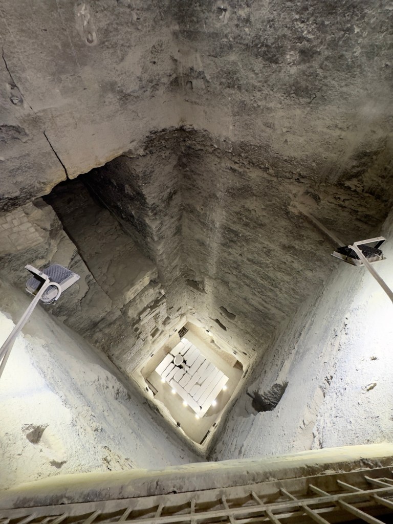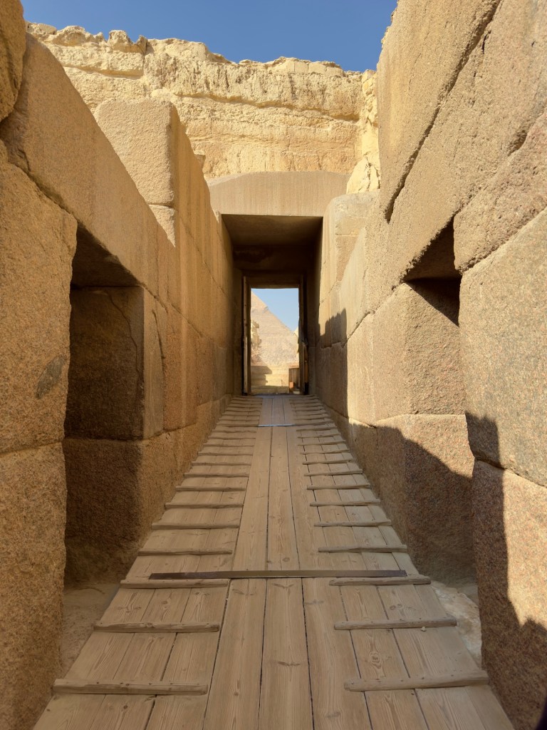 It starts with a quick detour through the Temple of Khafre — all massive limestone blocks and eerie stillness, like the world’s oldest minimalist lobby. The columns are thick, the light is soft, and everything feels weirdly preserved, like time hit pause around 2500 BCE.